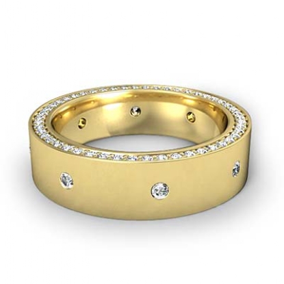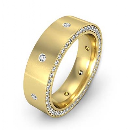 round diamond eternity men's wedding band made from 14k Gold Yellow. This satin finished flat ring features pave set diamonds all around the side of the band and the bezel set on top.