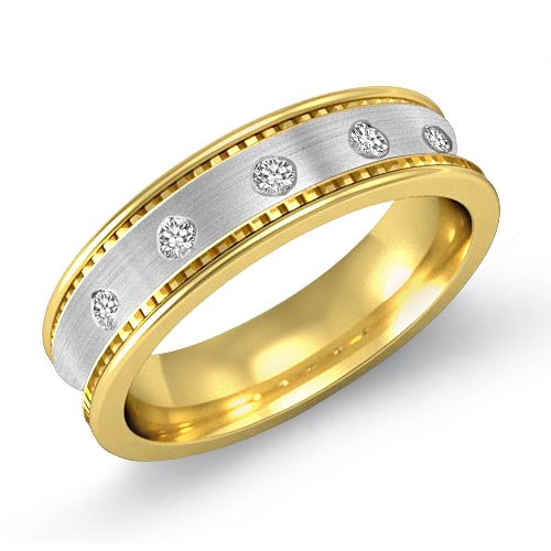 The solid men's diamond half wedding band made from 14k two tone gold. Showcasing milgrain & polished round edges in yellow gold and matte finish center in white gold with 0.10 carat 5 round diamonds in a bezel set.