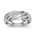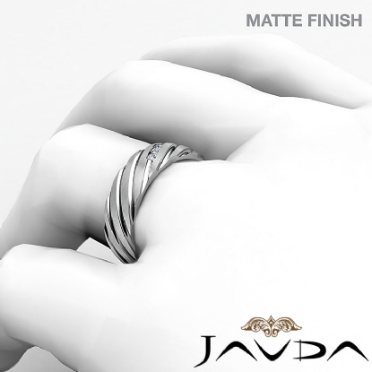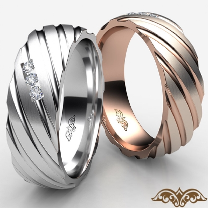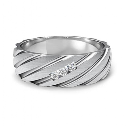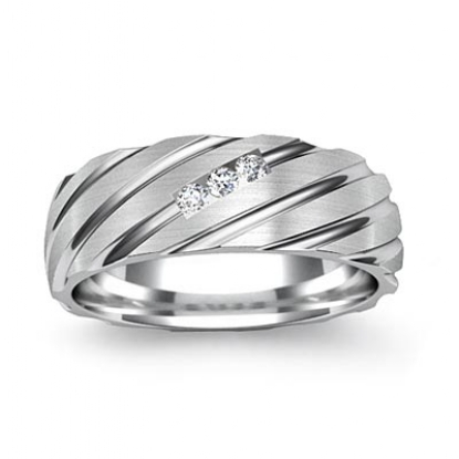 This stunning diagonal grooves diamond men's half wedding band is made from quality 14k white gold. Featuring matte finish and polished diagonal grooves with 3 stone 0.11 carat round diamond in a channel setting.