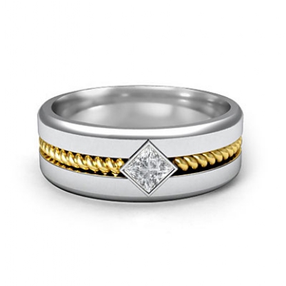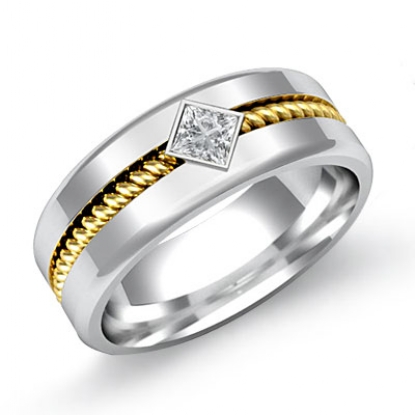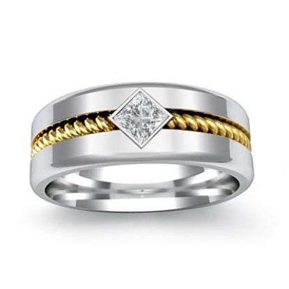 A perfect modern & traditional combination men's diamond wedding band is made from 14k two tone gold. Showcasing polished finish sides and center rope design in yellow gold with 0.10 carat 1 princess cut diamond set in a bezel setting.