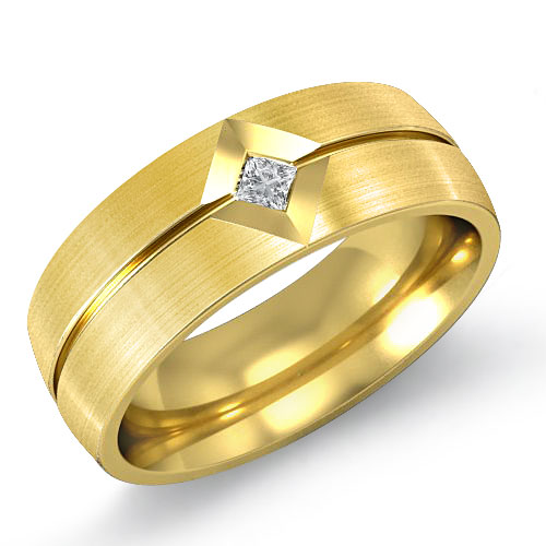 Luxurious & romantic matte men's kite set diamond half wedding band is made from solid 14k Gold Yellow. Featuring matte finished and center grooved with bezel set princess cut diamond set in a kite shape. Ready for pickup in 5-10 business days or Ships in 2 weeks