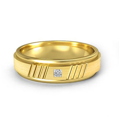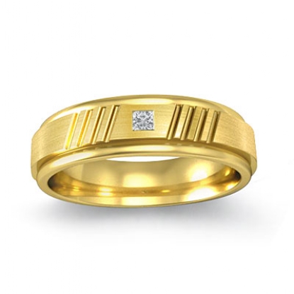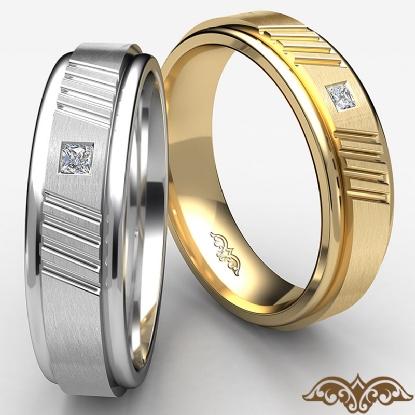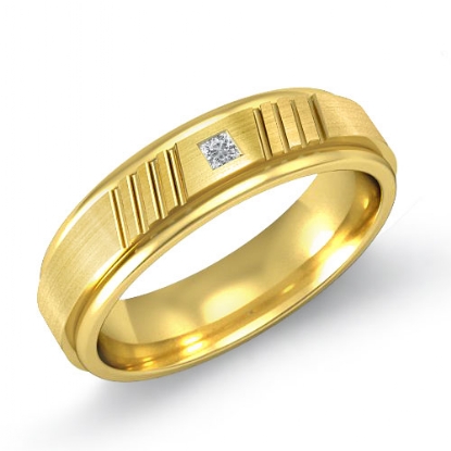 The affordable men's diamond wedding band made from 14k Gold Yellow. This gold wedding ring features matte finish center and polished round edges with princess diamond in a bezel set.
