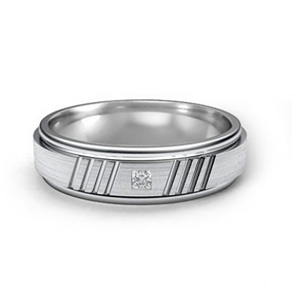 The affordable men's diamond wedding band made from 18k Gold White. This gold wedding ring features matte finish center and polished round edges with princess diamond in a bezel set.