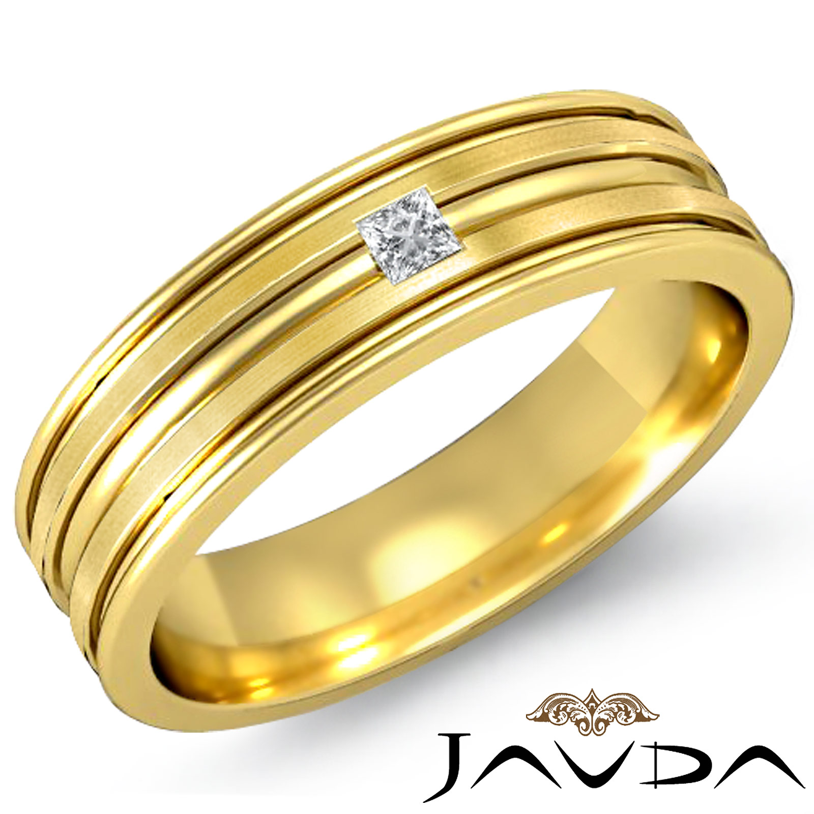 The classy diamond men's wedding band made from solid 18k Gold Yellow. Showcasing brushed finish center with princess cut diamond in a bezel set, this ring features parallel grooves for shiny and stylish look.