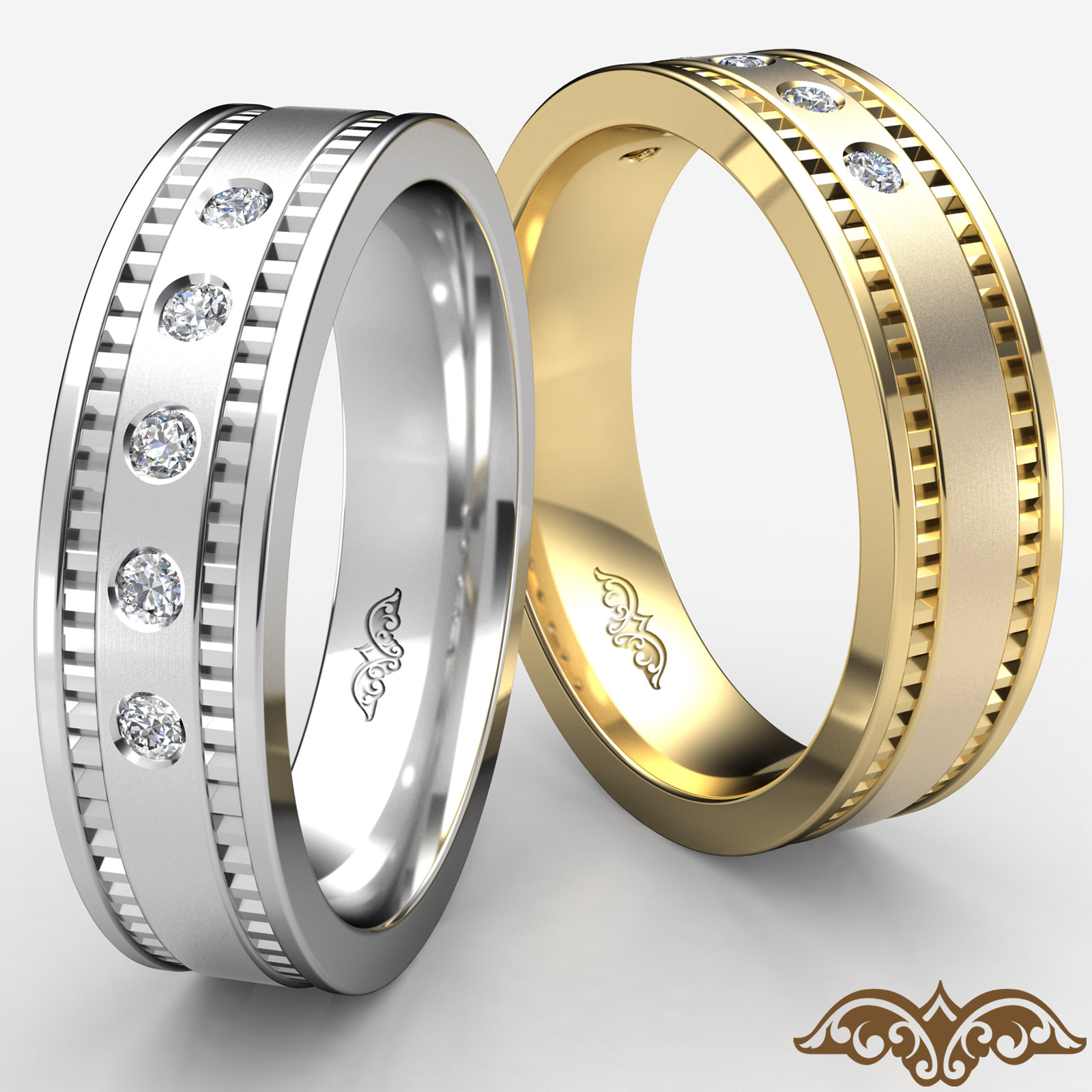 Handmade men's diamond wedding band made from solid 18k Gold Yellow. This brushed finish ring showcasing 5 round cut bezel set diamonds. The beautiful cuts on edges make this ring more unique and modern.