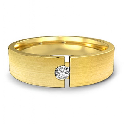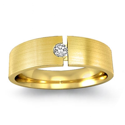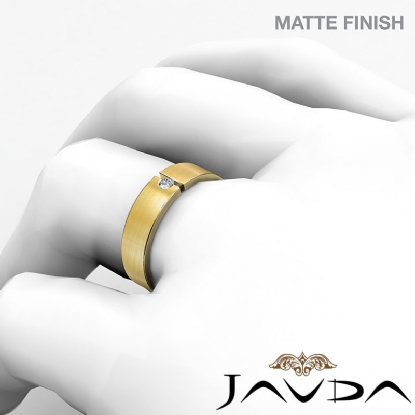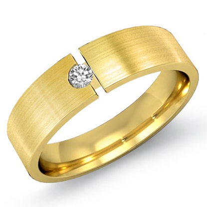A classic matte finished solitaire men's diamond half wedding band is crafted in solid 14k Gold Yellow. Featuring matte finished flat band with solitaire round diamond set in a bezel setting.