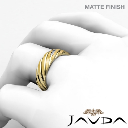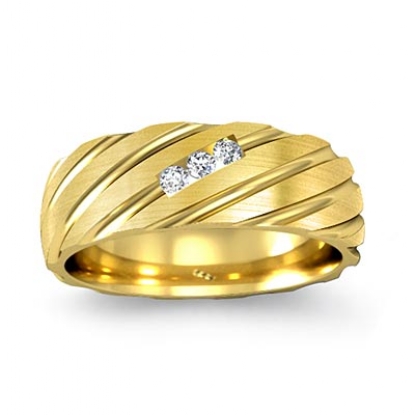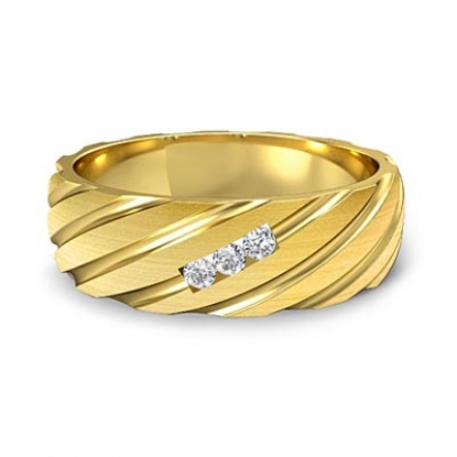 This stunning diagonal grooves diamond men's half wedding band is made from quality 14k Gold Yellow. Featuring matte finish and polished diagonal grooves with 3 stone round diamond in a channel setting.