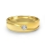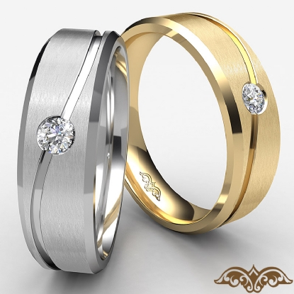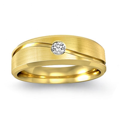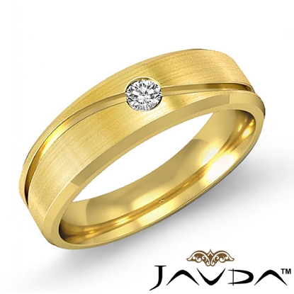 The dazzling curve design men's diamond half wedding band is made from . Featuring polished beveled edge and matte finished center with curve design and 18k Gold Yellow round diamond in a bezel setting.