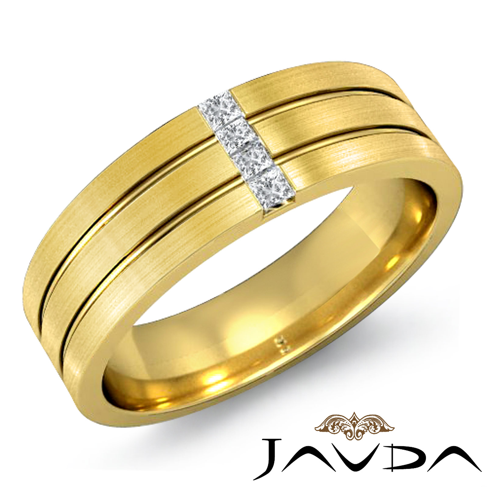 This classic matte finish diamond men's half wedding band is made from 14k Gold Yellow. Featuring 4 princess cut diamonds in a channel setting with two parallel grooves.