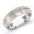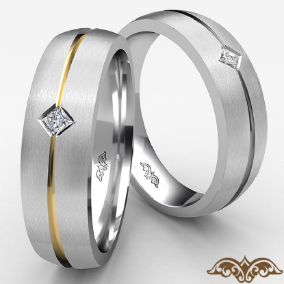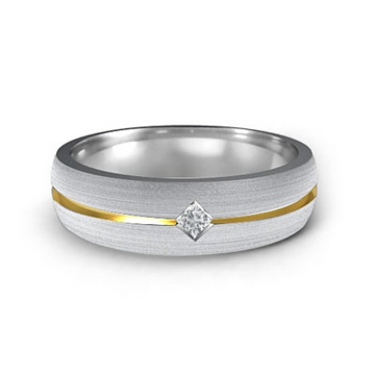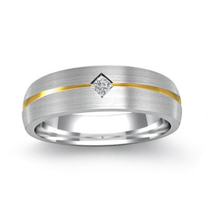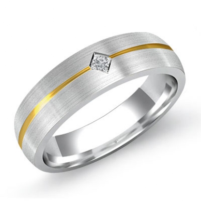 This classic 14k 2 tone gold men's diamond wedding band is comfort fit. Featuring white gold matte finish surface and polished grooved in yellow gold with 0.15 carat 1 princess cut diamond set in a bezel setting. Available in 14k & 18k 2 tone gold.