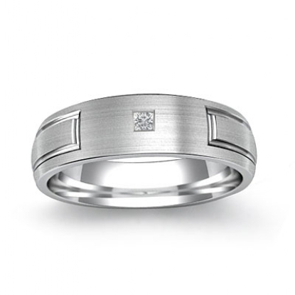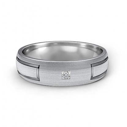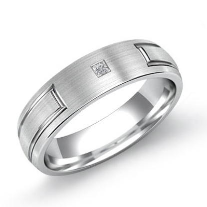 The grooved design men's diamond wedding band made from 14k white gold. This solid gold ring features matte finish with 0.15 carat 1 princess diamond in a bezel set.
