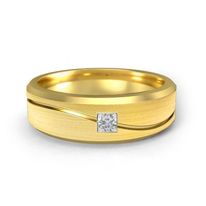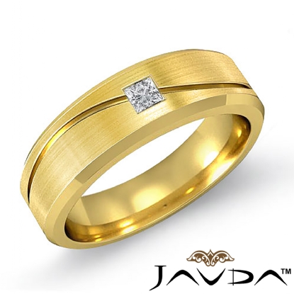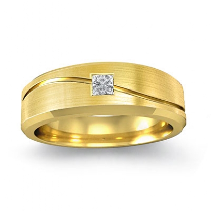 This elegant 14k Gold Yellow curve design men's diamond half wedding band is 7mm wide. Showcasing matte finished and center curve design with princess cut diamond in a bezel setting.