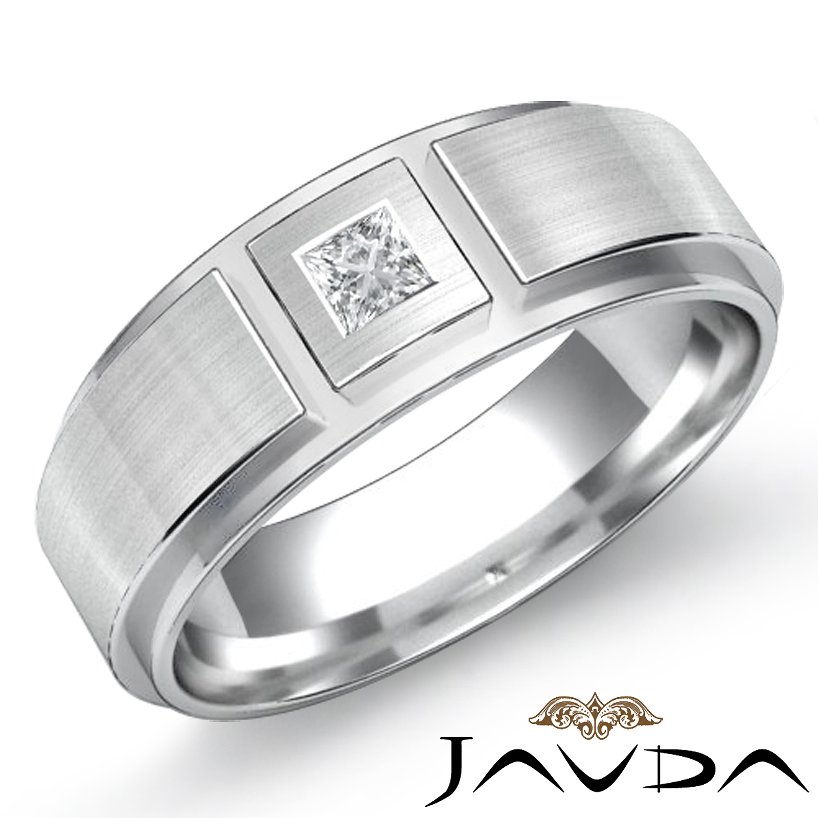 Classic flat edge matte center solitaire men's diamond half wedding band is made from 18k Gold White. This solid ring features flat edge and matte finished center with solitaire princess diamond set in a bezel setting.
