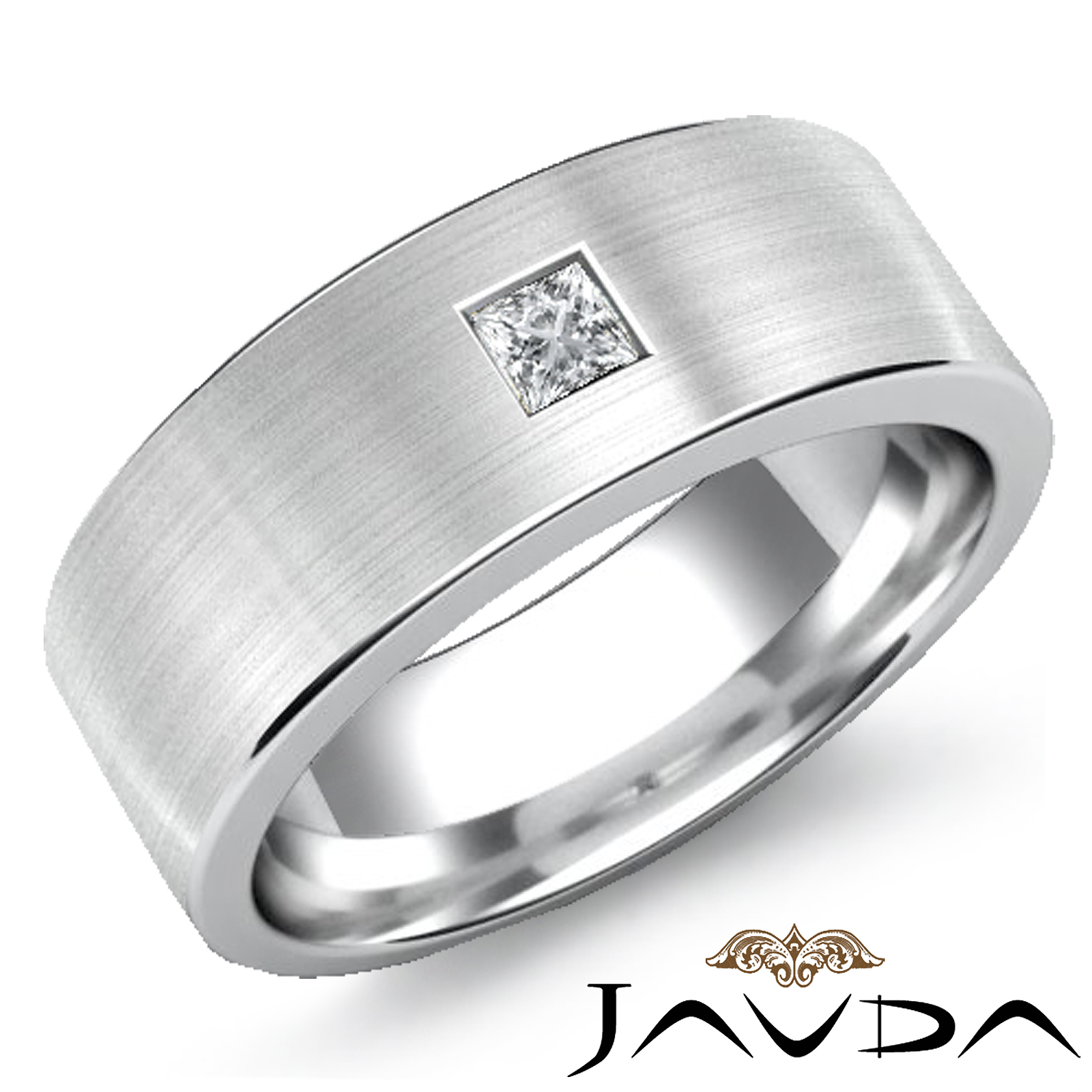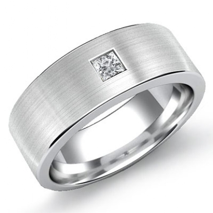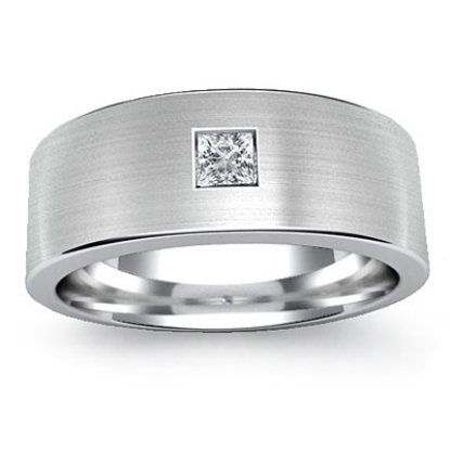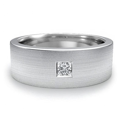 Fashionable flat brushed finish men's diamond half wedding band is made from 18k Gold White. Showcasing flat brushed finished with princess cut diamond in a bezel setting.
