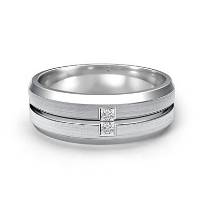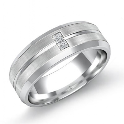 The timeless modern touch grooved men's diamond half wedding band is made from 18k Gold White. Featuring polished beveled edge and matte finished center with grooved design and 2 princess cut diamond in a bezel setting.