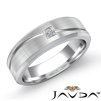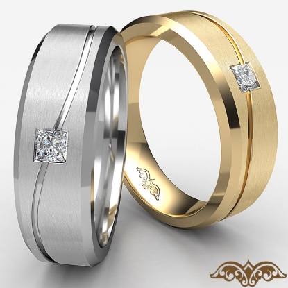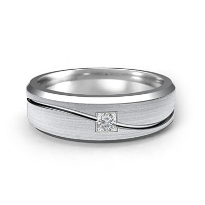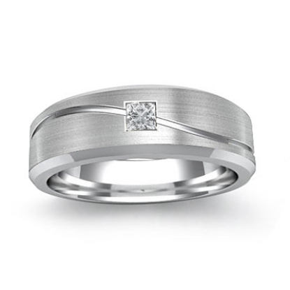 This elegant 18k Gold White curve design men's diamond half wedding band is 7mm wide. Showcasing matte finished and center curve design with princess cut diamond in a bezel setting.