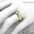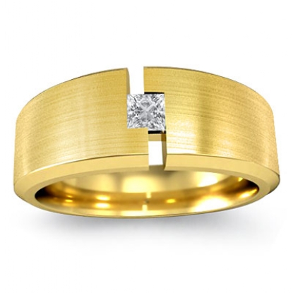 A bold & modern solitaire princess bezel diamond men's half wedding band is made from 18k Gold Yellow. Showcasing polished edge and matte finish center with one princess cut diamond set in a bezel setting.