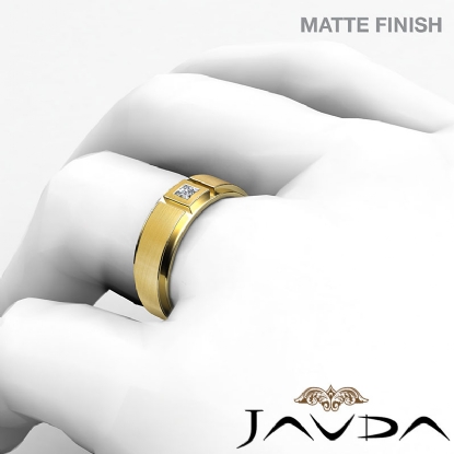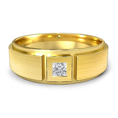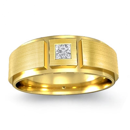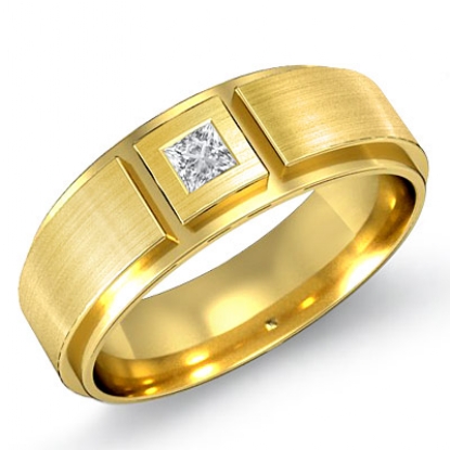 Classic flat edge matte center solitaire men's diamond half wedding band is made from 18k Gold Yellow. This solid ring features flat edge and matte finished center with solitaire princess diamond set in a bezel setting.