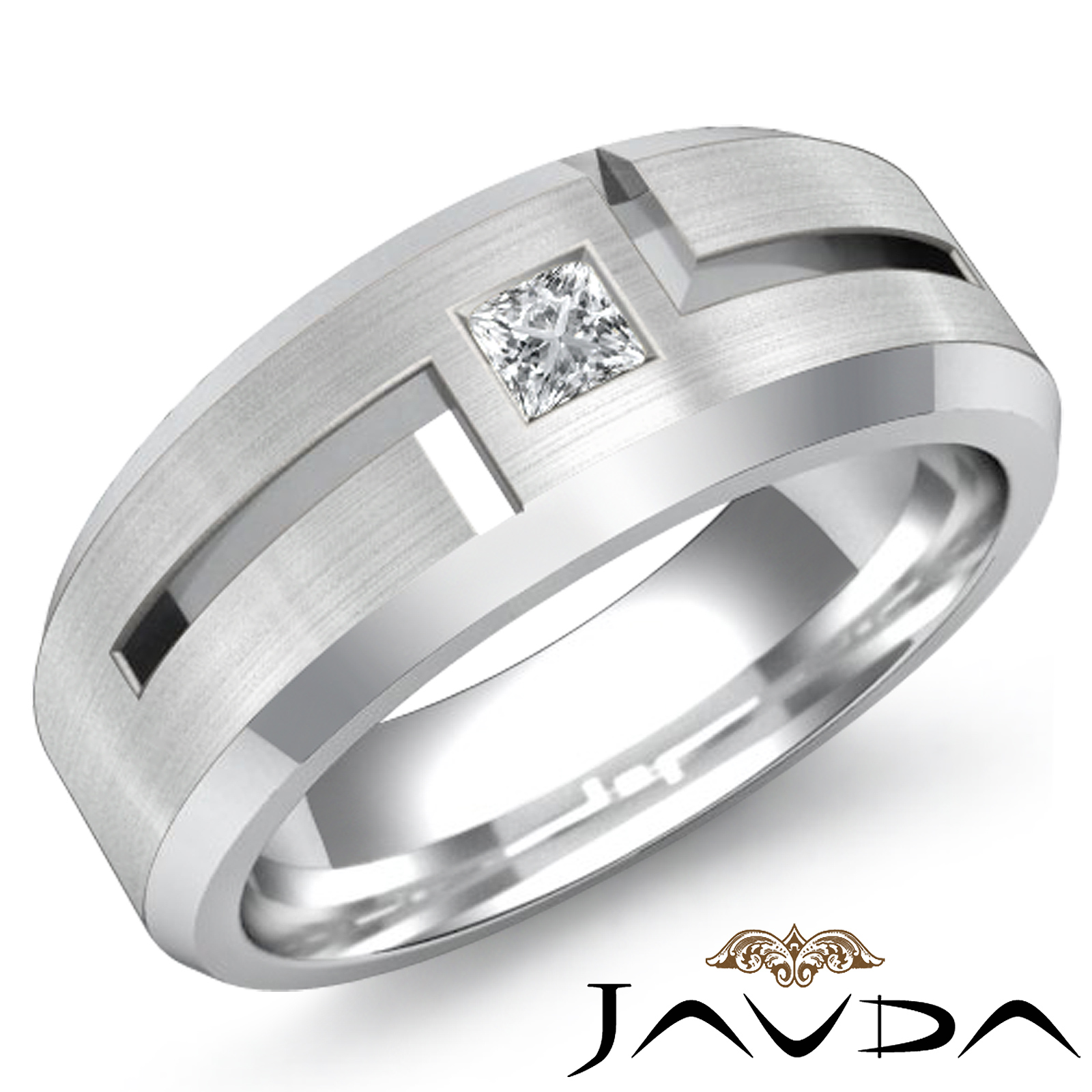 Fashionable handmade solitaire princess diamond men's half wedding band is made from Platinum 950. Showcasing polished beveled edge and matte finished center with 1 princess diamond in a bezel setting.