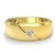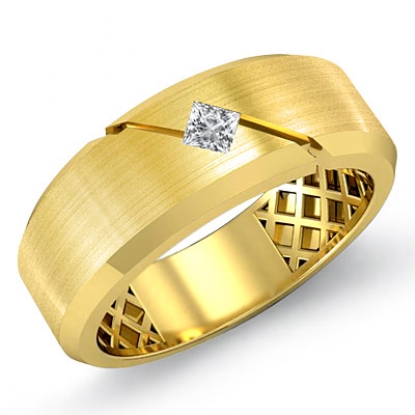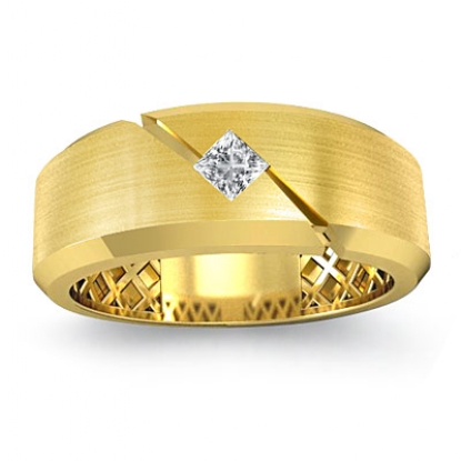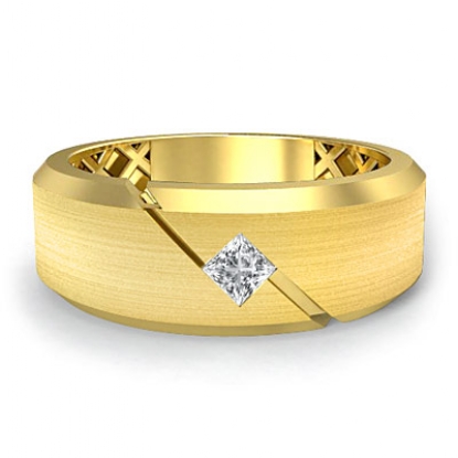 Simple and traditional solitaire diamond men's half wedding band is made from 18k Gold Yellow. Showcasing polished flat edge and matte finished center with 1 princess diamond in a bezel setting on diagonal cut.
