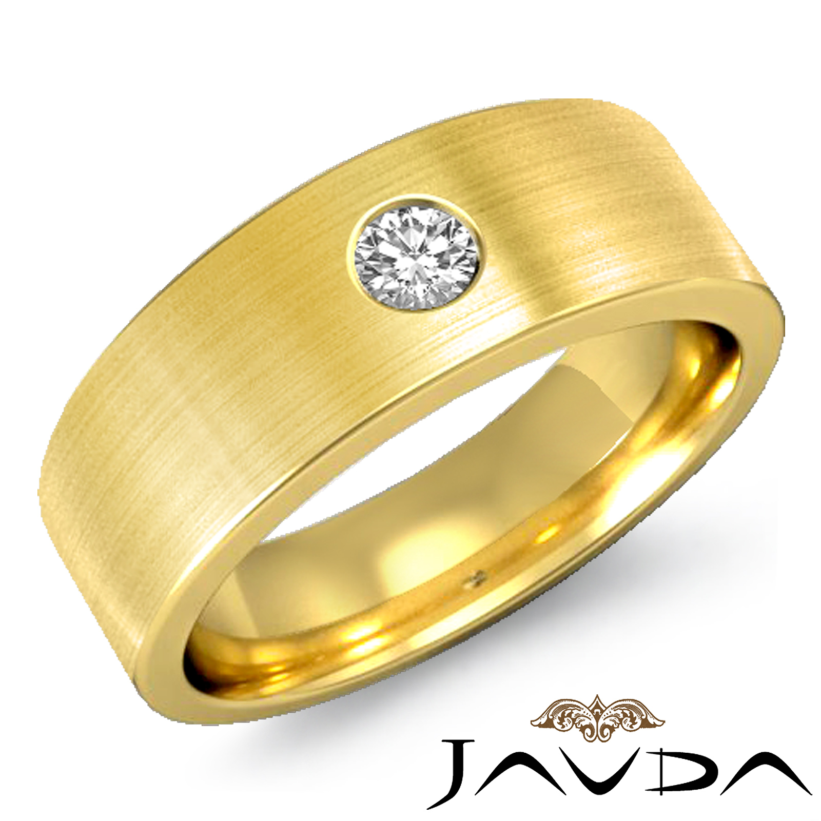 The classic flat brushed finish round diamond men's half wedding band is made from 14k Gold Yellow. Featuring flat brushed finished with round cut diamond in a bezel setting.