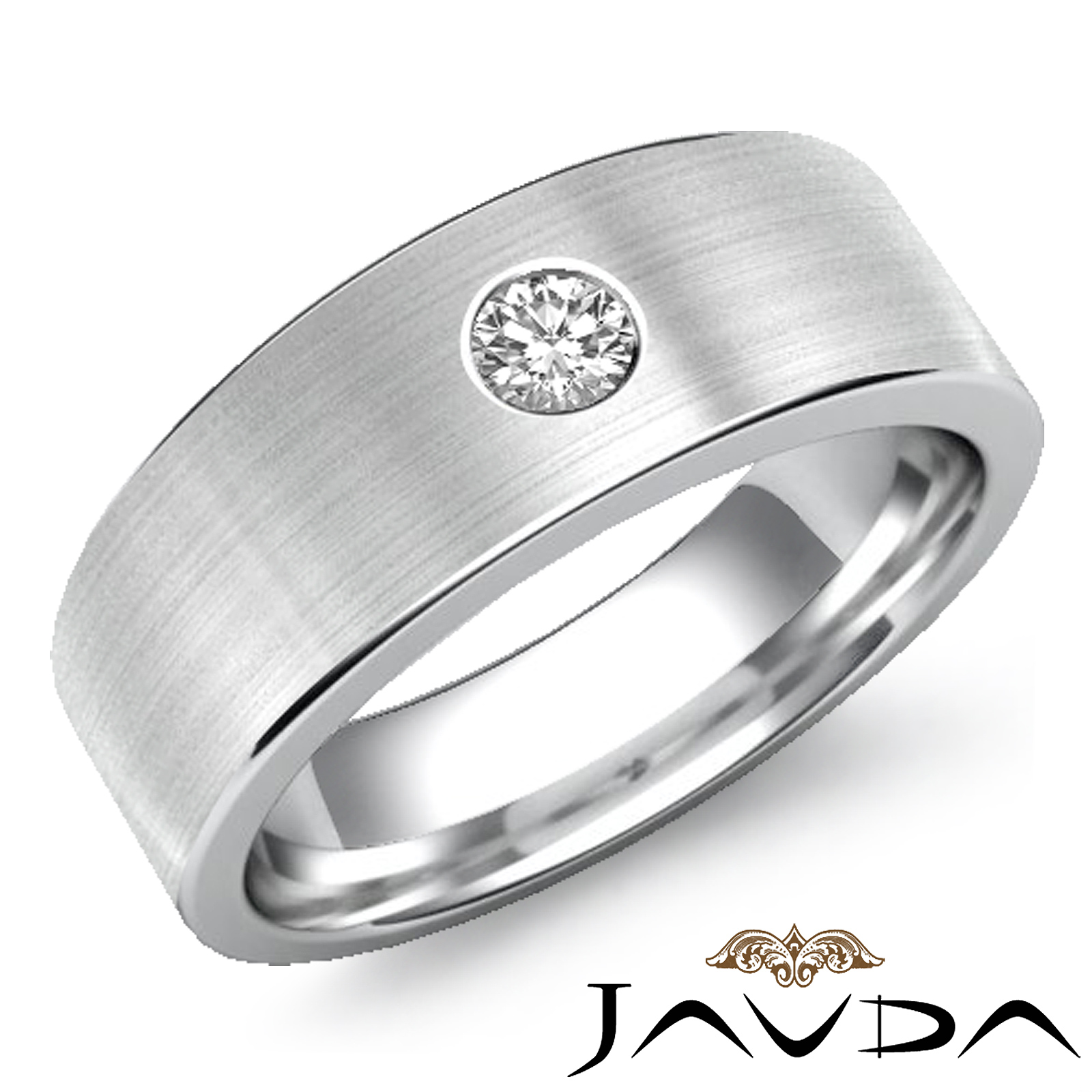 The classic flat brushed finish round diamond men's half wedding band is made from Platinum 950. Featuring flat brushed finished with round cut diamond in a bezel setting.