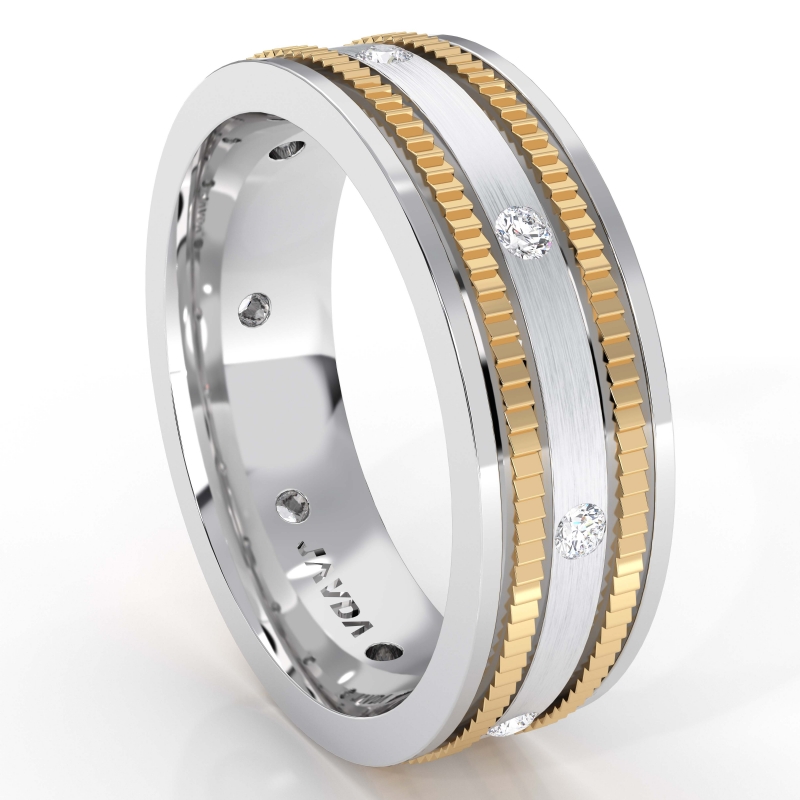 The luxurious men's diamond eternity wedding band crafted in 14k 2 tone gold. Featuring polished center with 0.16 carat round cut diamonds in a bezel set and the edges in yellow gold that give the ring a sophisticated designer look.