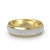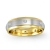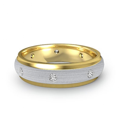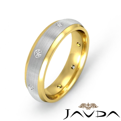 The classic design men's diamond eternity wedding band made from solid 14k 2 tone gold. This 6mm band features yellow gold polished step edges and white gold matte finish center with 0.16 carat round cut diamonds in a bezel set.