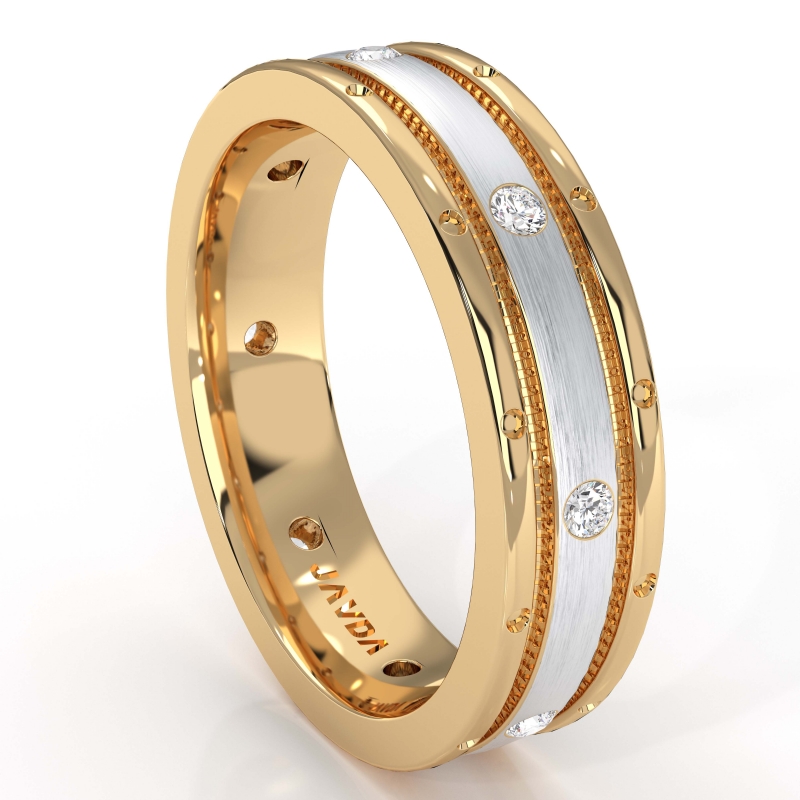 A bold and handsome design men's diamond eternity wedding band crafted in 14k 2 tone gold. This wedding ring features yellow gold polished edges and white gold center dome with 0.16 carat round cut diamonds in a bezel set.