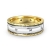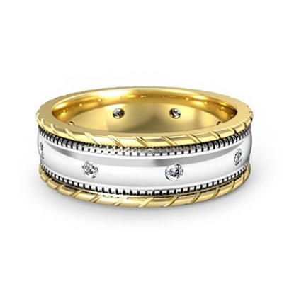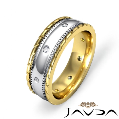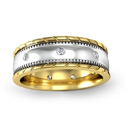 This unique design men's diamond eternity wedding band made from 14k 2 tone gold. Featuring rope and milgrain edges in yellow gold and low dome center in white gold with 0.16 carat round cut diamonds in a bezel set.