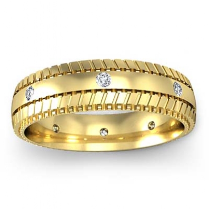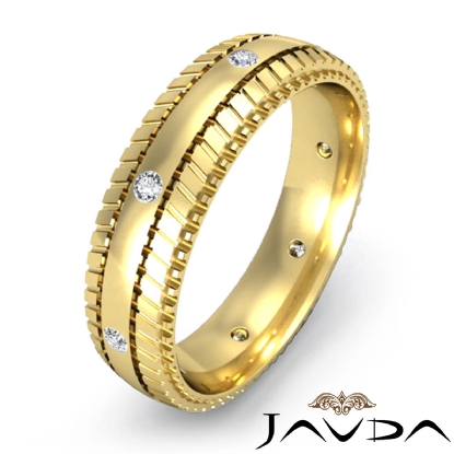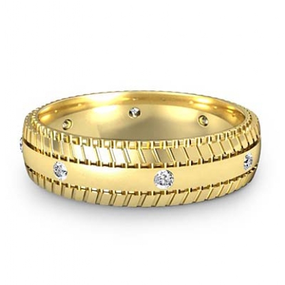 This tire tread pattern men's diamond eternity wedding band made from 14k Gold Yellow. Featuring round diamond in a bezel setting with a dome design making it very comfortable.