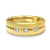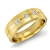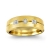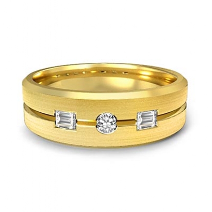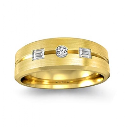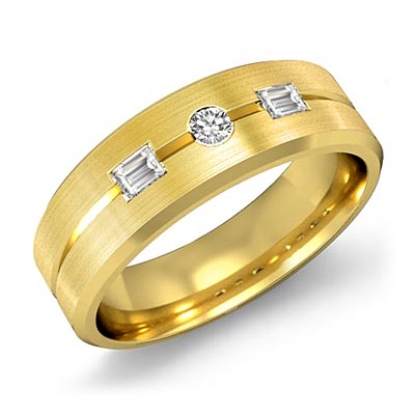 Luxurious 3 stone baguette & diamond men's half wedding band is made from 14k Gold Yellow. Showcasing polished beveled edges and matte finished center grooved with round diamond &