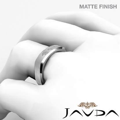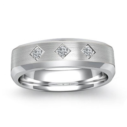 Euro shank kite style princess cut diamond men's half wedding band is made from 18k Gold White. This unique ring features polished beveled edge and euro shank in matte finish center with 3 stone princess diamond in a bezel setting.