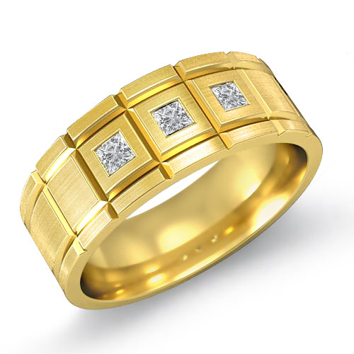 Stunning grooved diamond men's half wedding band is crafted in quality 18k Gold Yellow. Showcasing matte finished vertical and horizontal grooved with princess cut diamonds in a bezel set.