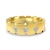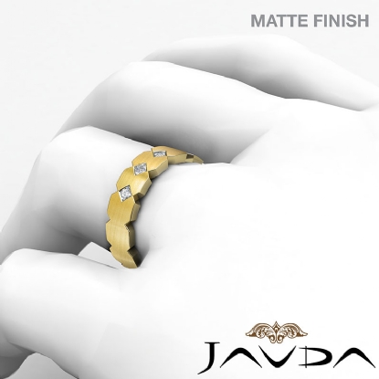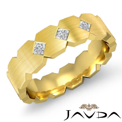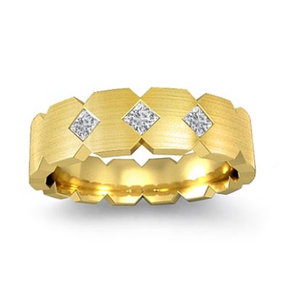 The stylish diamond men's half wedding band is made from solid 14k Gold Yellow. This wedding ring features matte finish center and cut edges with 3 princess cut diamond in a bezel set.