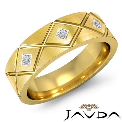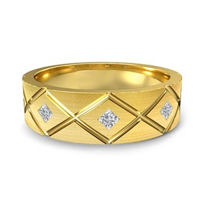 A truly zigzag pattern this diamond men's half wedding band is made from 18k Gold Yellow. This ring features princess cut bezel set diamonds beautifully set in a kite shape angle.