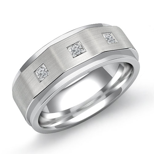 Elegant matte finish diamond men's half wedding band is made from solid 18k Gold White. This ring features polished step edge and matte finished center with 3 stone princess cut diamonds in a bezel set.