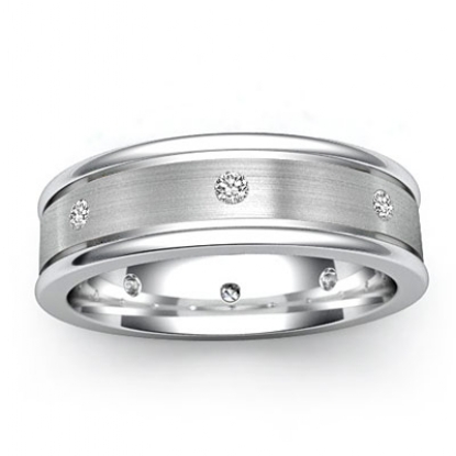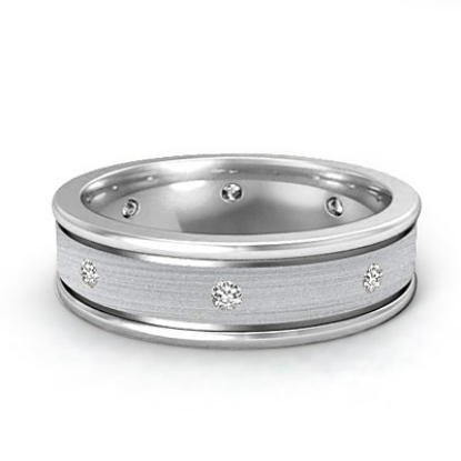 Comfort fit diamond eternity men's wedding band made from solid 14k white gold. This ring features highly polished round edges and brushed finish center with 0.20 carat round diamonds in a bezel setting.