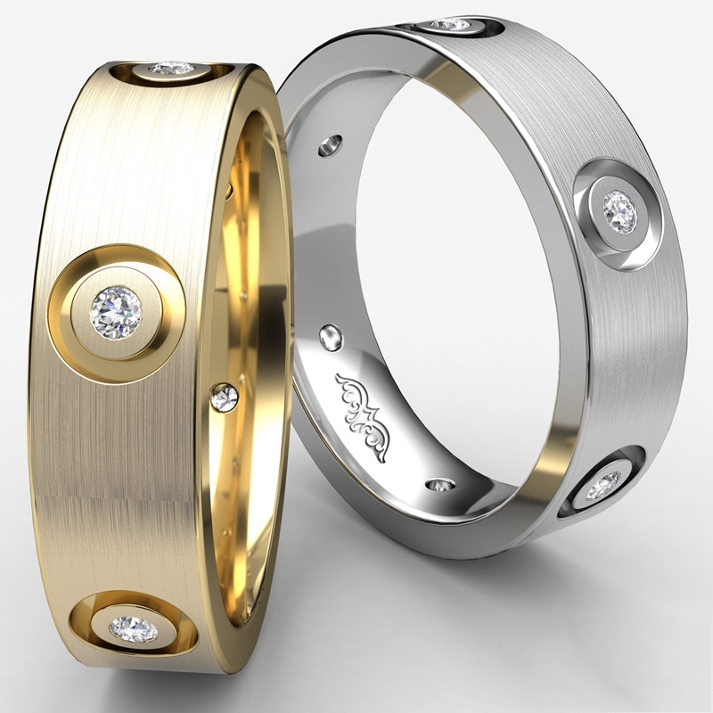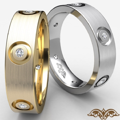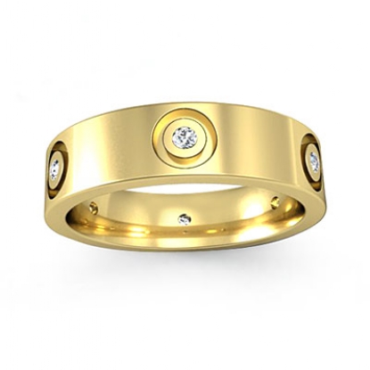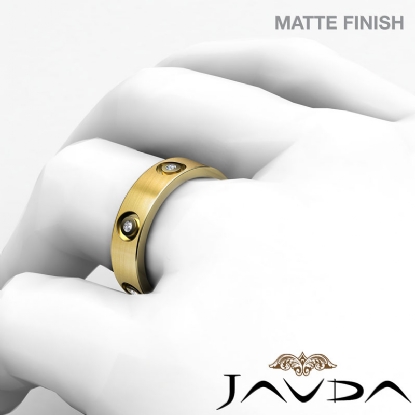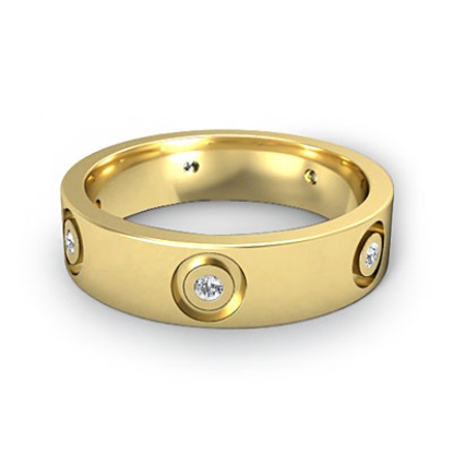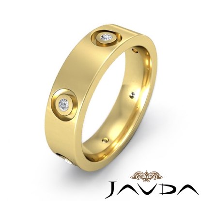 The designer diamond eternity men's wedding band crafted in 18k Gold Yellow. This unique ring features round cut diamonds set in a bezel setting.