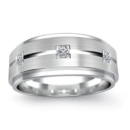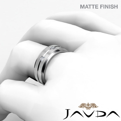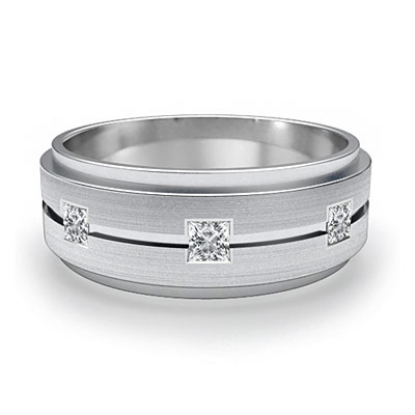 Stunning grooved bezel 3 stone diamond men's half wedding band is made from solid 18k Gold White. Featuring polished flat edge and matte finish center with grooved set with three princess cut diamonds in a bezel setting.
