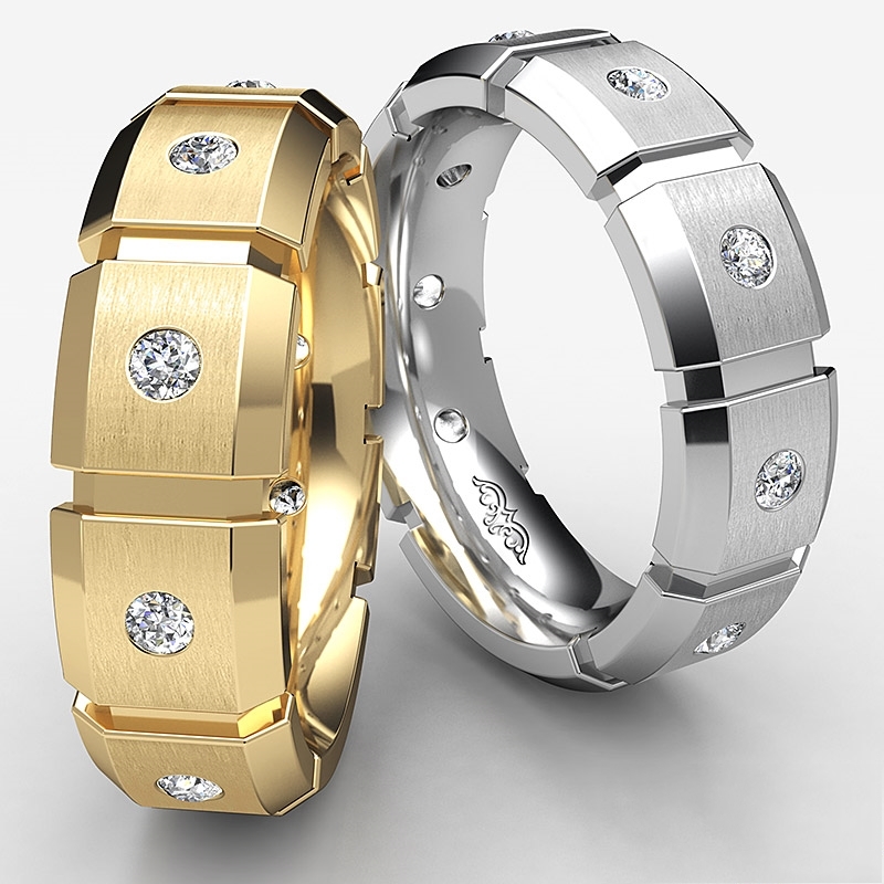 A stunning block link round diamond men's eternity wedding band is made from solid 14k Gold Yellow. Featuring polished finished beveled edge and block link with round diamonds in a bezel setting.