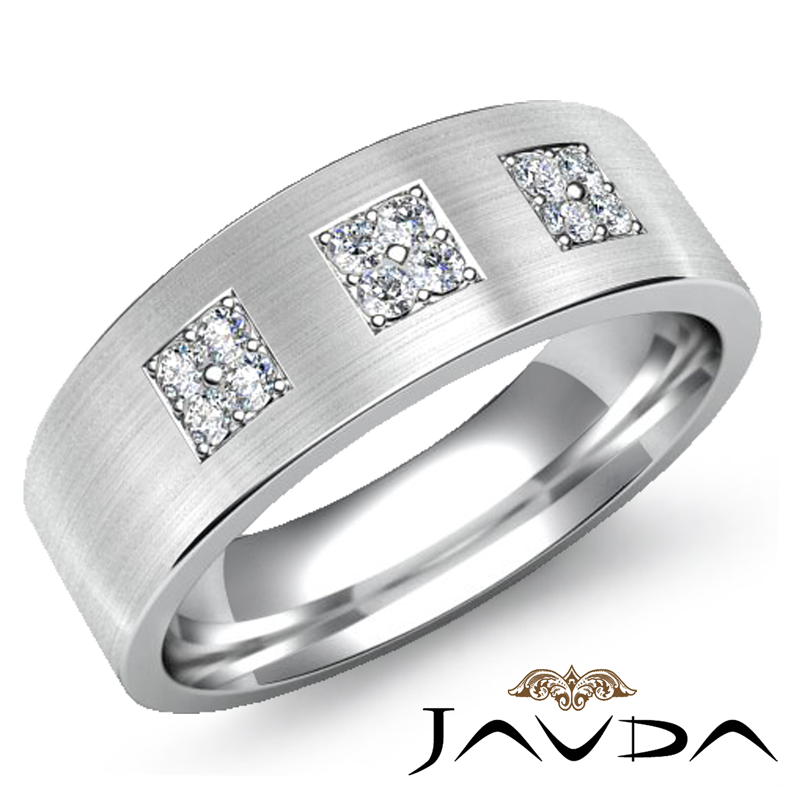 Classic & durable matte finish 3 square set round diamond men's half wedding band is made from solid 14k white gold. Featuring matte finish band with 0.25 carat pave round diamonds beautifully set in a square.