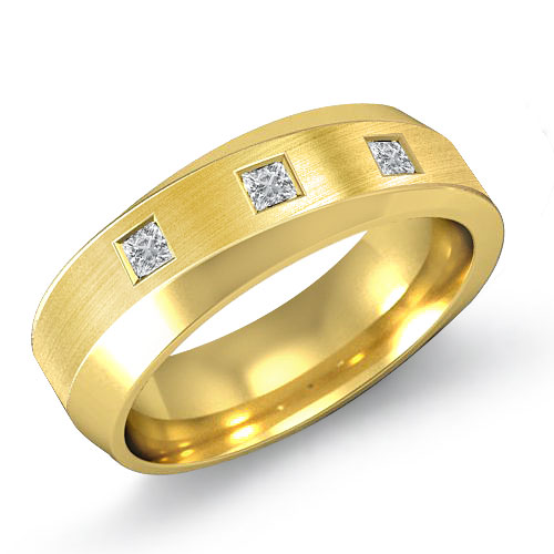 This sophisticated diagonal matte finish diamond men's half wedding band is crafted in 14k Gold Yellow. Featuring polished beveled sides and matte finished center with 3 stone princess cut diamonds set in a bezel setting.