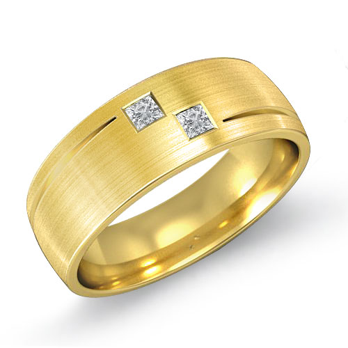 This stunning low dome matte finish diamond men's half wedding band is made from 14k Gold Yellow. Showcasing matte finished with grooved and 2 stone princess cut diamonds set in a bezel setting gives a stylish look.