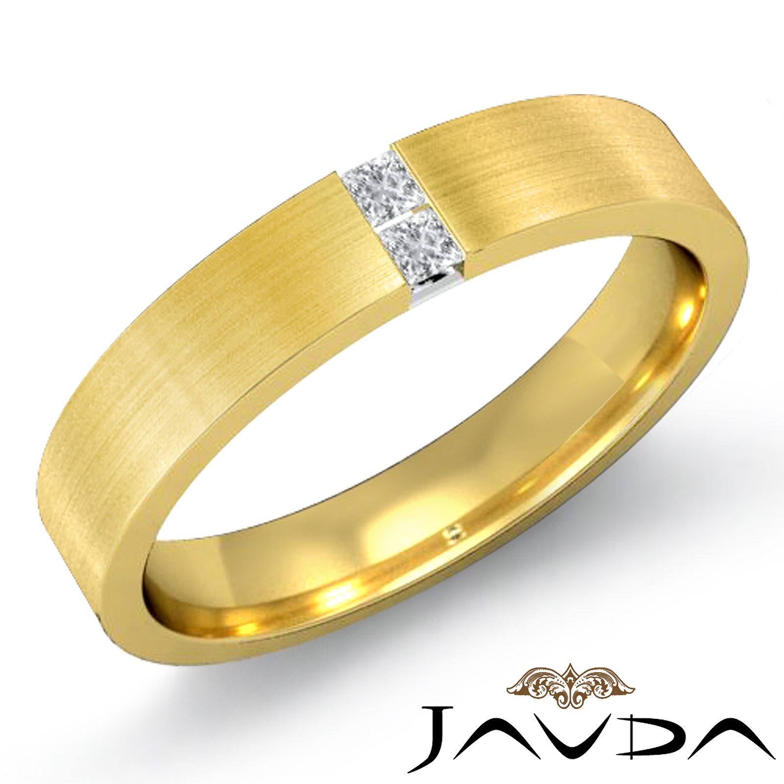Matte finish diamond men's half wedding band is crafted in 18k Gold Yellow. This wedding ring features matte finished with princess cut diamonds set in a channel setting.