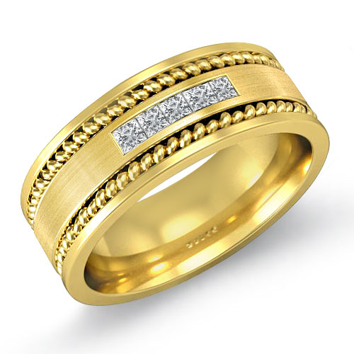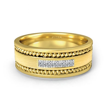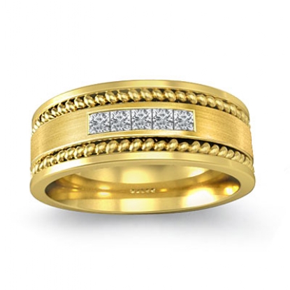 This comfort fit men's diamond wedding band crafted in solid 18k Gold Yellow. The wedding ring has intricate rope edge detailing to give it a stylish look with princess cut diamond in a channel setting.
