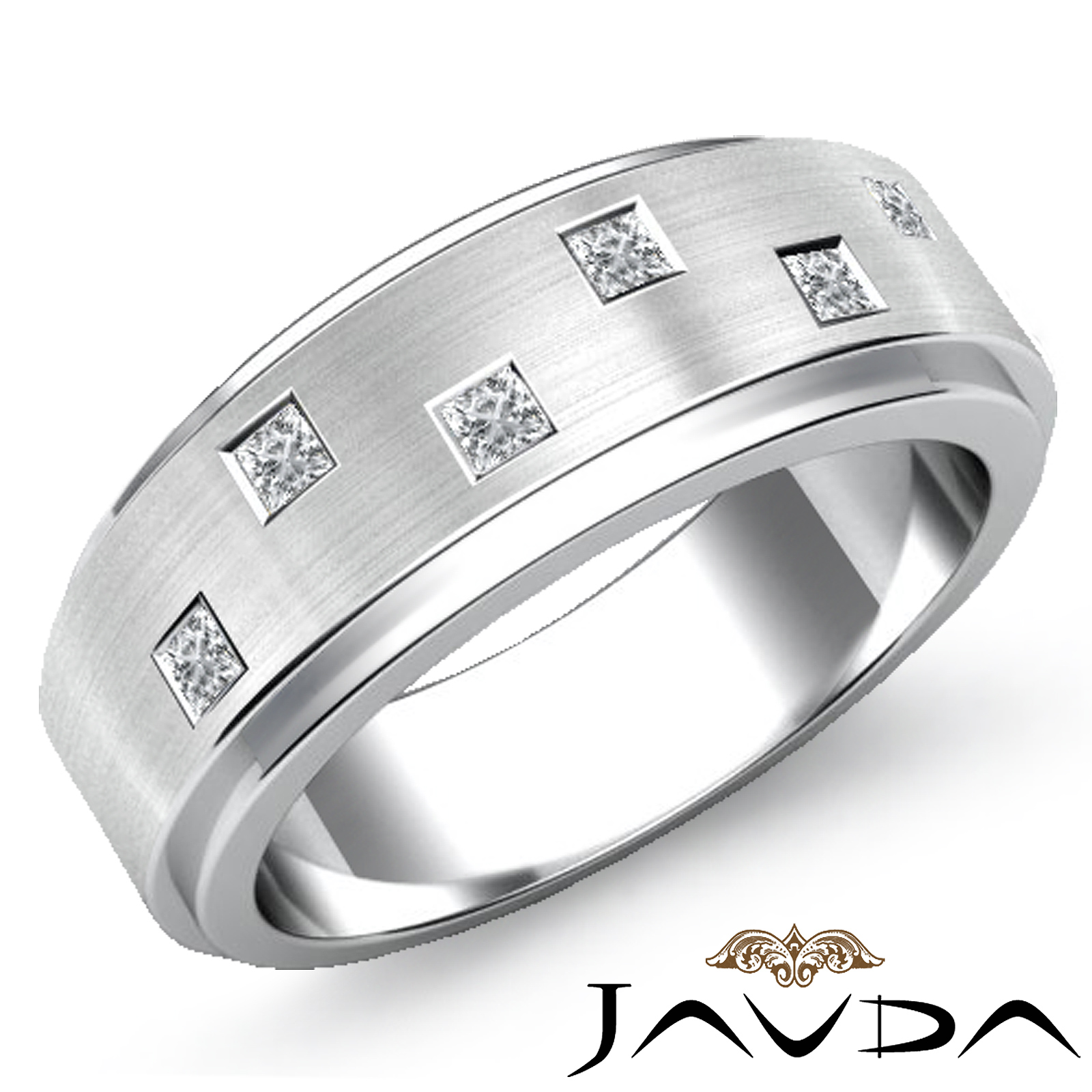 Classic and durable step edge matte finished princess diamond men's half wedding band is made from quality 18k Gold White. Showcasing polished step edge and matte finish center with princess diamonds set in a bezel setting.