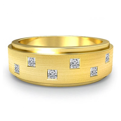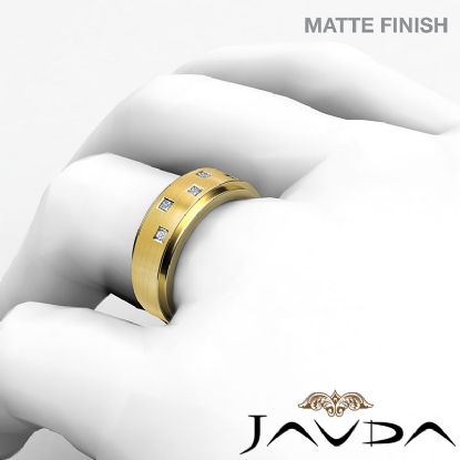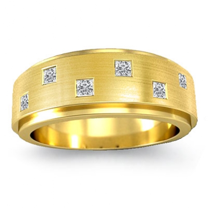 Classic and durable step edge matte finished princess diamond men's half wedding band is made from quality 18k Gold Yellow. Showcasing polished step edge and matte finish center with princess diamonds set in a bezel setting.