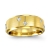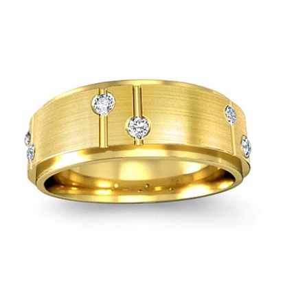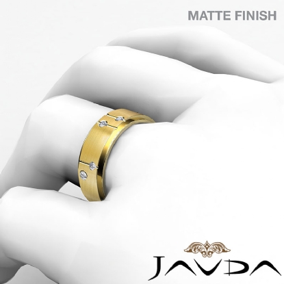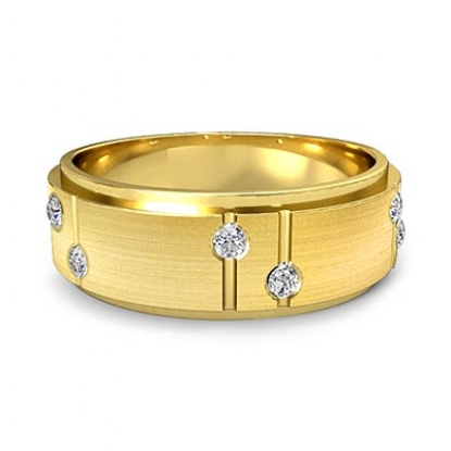 Charming diamond men's half wedding band is made from solid 18k Gold Yellow. Showcasing polished step edge and matte finish center with round bezel diamonds beautifully set on vertical grooves.