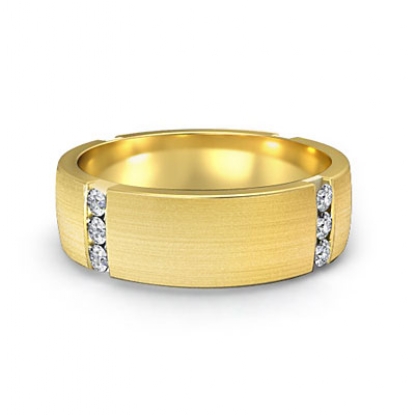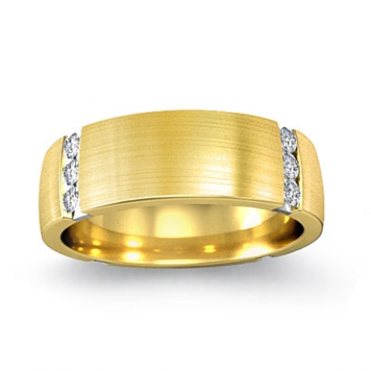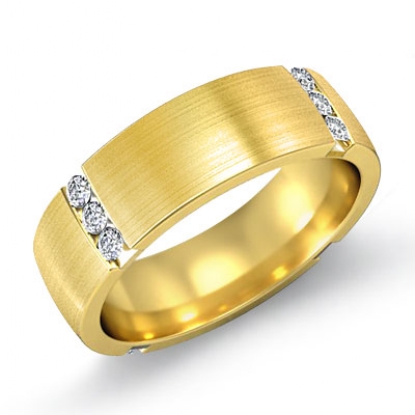 The 6mm wide matte finish men's diamond eternity wedding band is crafted in 14k Gold Yellow. Featuring round cut diamonds set in a channel setting.